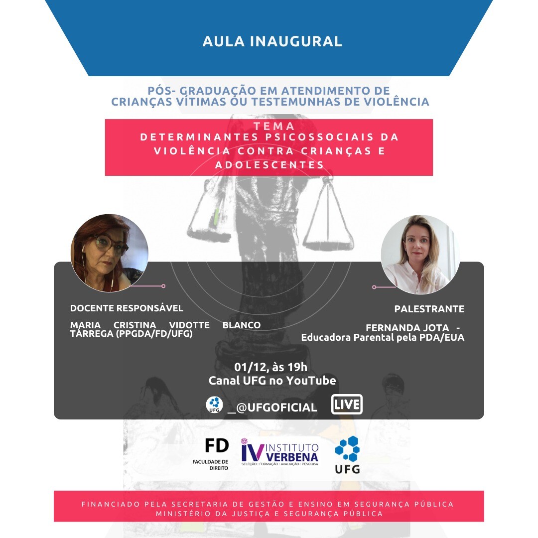 A aula inaugural da Especialização em Atendimento de Crianças e Adolescentes Vítimas ou Testemunhas de Violência é aberta ao público, que pode assistir à transmissão no Canal da UFG no Youtube, às 19 horas. Clique AQUI para acessar a página da Live. A programação conta com uma conferência da psicóloga da Infância e Adolescência Fernanda Jota, que também é mestra em Psicologia Clínica e Cultura e Educadora Parental pela PDA - EUA. A coordenação da conferência será realizada pela professora Maria Cristina Vidotte Blanco Tárrega, coordenadora da Especialização em Atendimento de Crianças e Adolescentes Vítimas ou Testemunhas de Violência e docente da Faculdade de Direito da UFG.